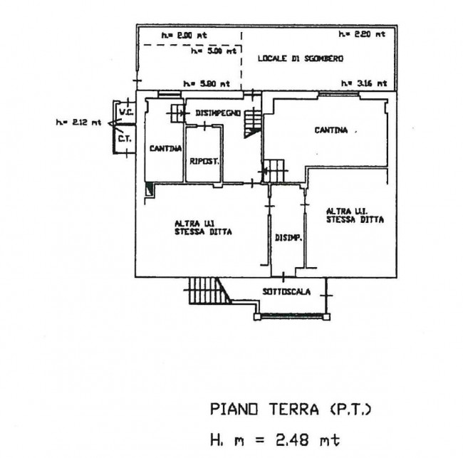 · Il piano terra, di 137 mq circa è composto da 2 autorimesse, 2 cantine, ripostiglio, disimpegno, un grade locale di sgombero di circa 39 mq, lavanderia e centrale termica.