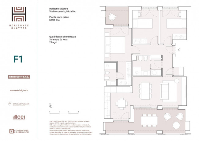 UNITA' F 1 ingresso su disimpegno soggiorno, cucina abitabile con accesso sul terrazzo; zona notte con 3 camere e doppi servizi oltre ad utile ripostiglio. Il tutto impreziosito da una loggia coperta godibile.