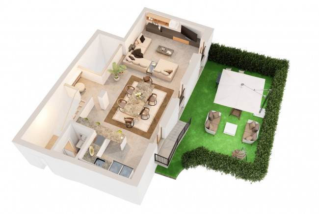 A completare il livello, un bagno di servizio e l'accesso diretto al giardino privato.