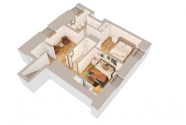 La zona notte ospita due camere da letto, entrambe dotate di bagno privato, oltre a una comoda zona studio.