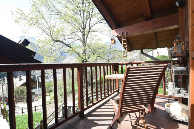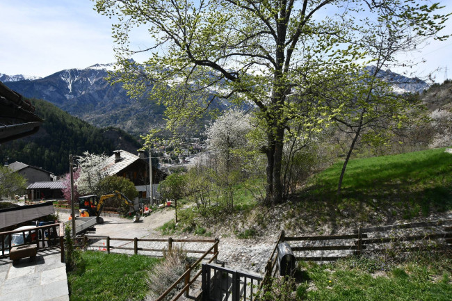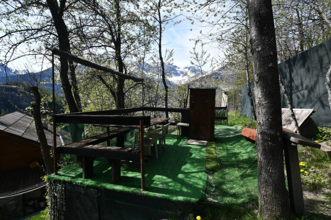 Intorno alla baita c'è un ampio giardino di proprietà con terrazzamenti e zona Barbecue. Accanto all'ingresso dell'appartamento c'è un locale coperto con forno a legna ed angolo cottura.